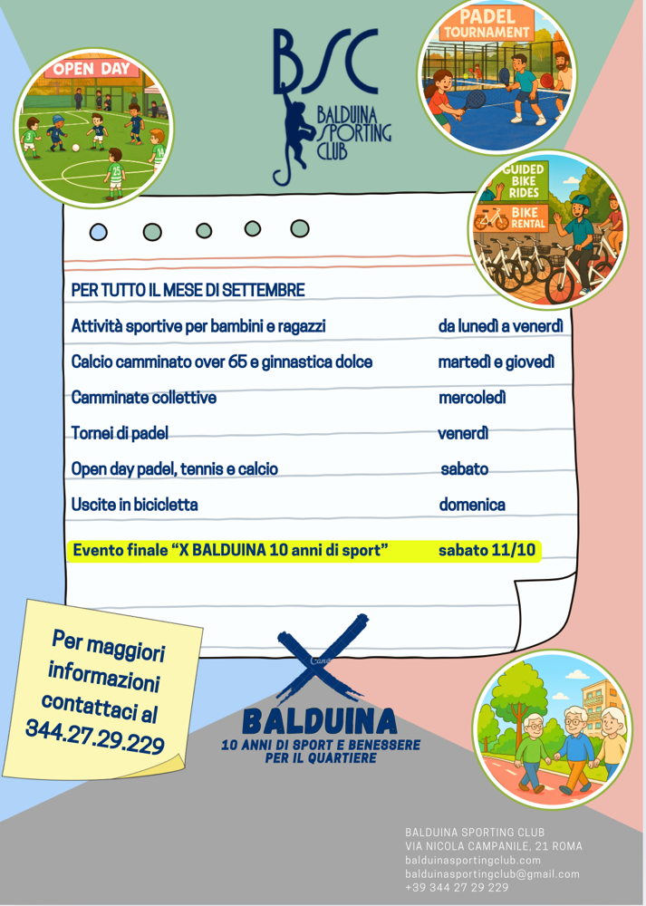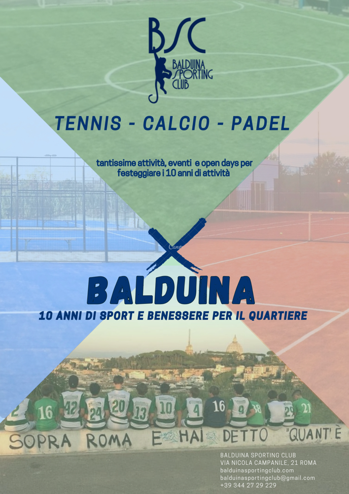Il Balduina Sporting Club celebra i suoi primi dieci anni di attività con un grande evento aperto a tutta la cittadinanza: “X Balduina – 10 anni di Sport e benessere per il quartiere”, un mese di festa e partecipazione che si terrà a settembre 2025 presso l’impianto di Via Nicola Campanile 21.